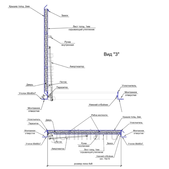 Посадочный размер 800х800 (в свету по опорным поверхностям не менее 690х740) в раме из уголка 90х90 без утеплителя. Опционно борт можно изготовить в неравнополочном исполнении:
